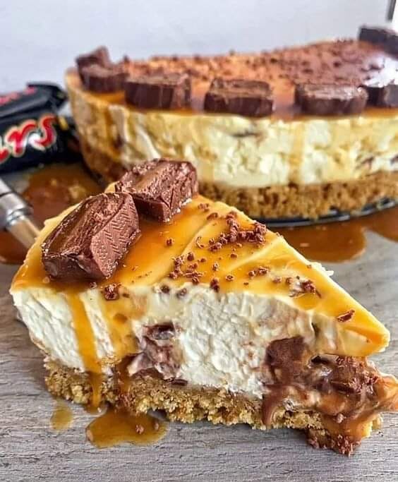 4. Once set, drizzle caramel sauce over the cake and decorate with leftover chunks of Mars and chocolate shavings.