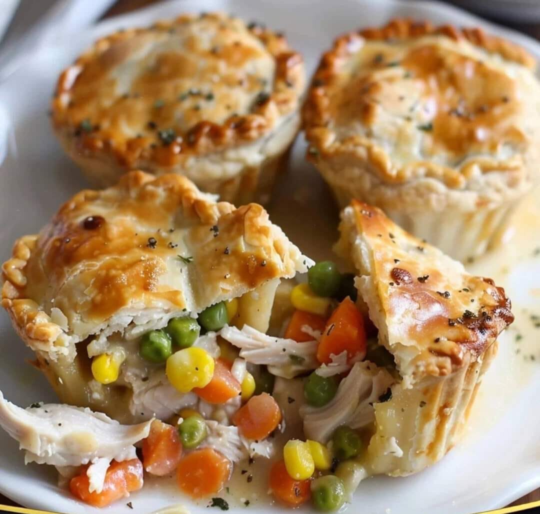 or meal prep. These individual pot pies feature a flaky, golden crust enveloping a rich, creamy chicken and vegetable filling, making them both delicious and convenient.